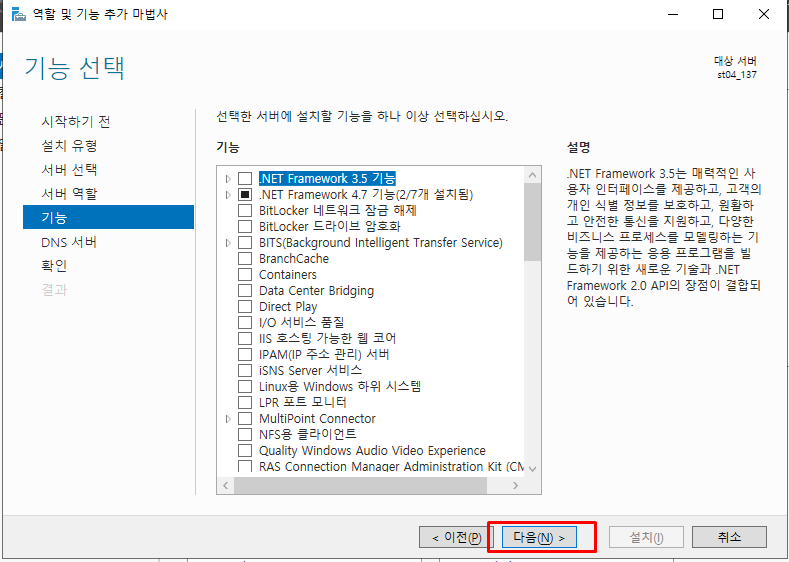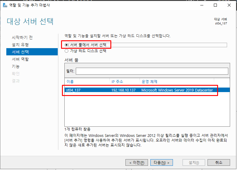 설치 선택 확인에서 필요한 경우 서버 다시시작을 선택하고 설치를 누른다.