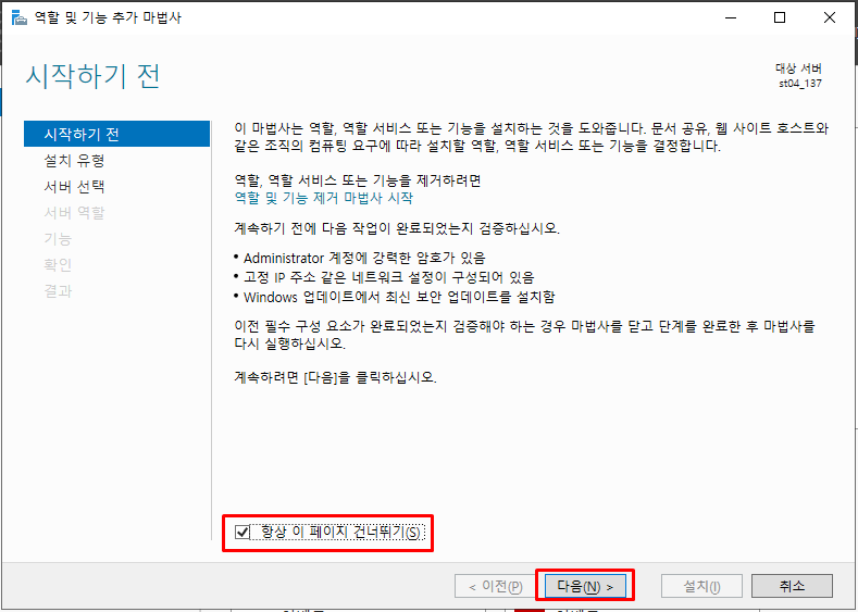 시작하기 전 페이지는 항상 건너뜀으로 설정하고 넘어간다.