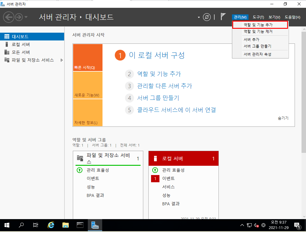 서버 관리자에서 관리 > 역할 및 기능 추가에 들어간다.