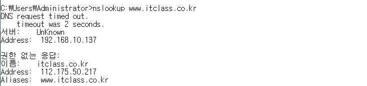 cmd 창에서 nslookup 명령어로 DNS 서버 작동 여부를 확인한다.