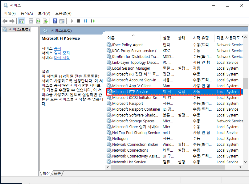 서비스에서 [Microsoft FTP Service], [World Wide Web Publishing 서비스] 가 자동 실행 중인지 확인한다.
