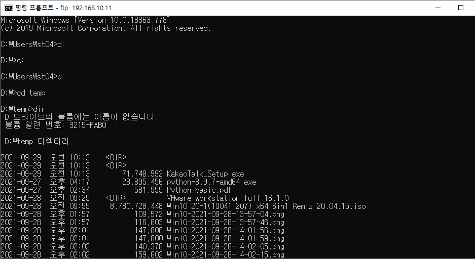 [ftp 192.168.10.11] FTP로 접속 > 암호 입력 (화면에 안보여짐)