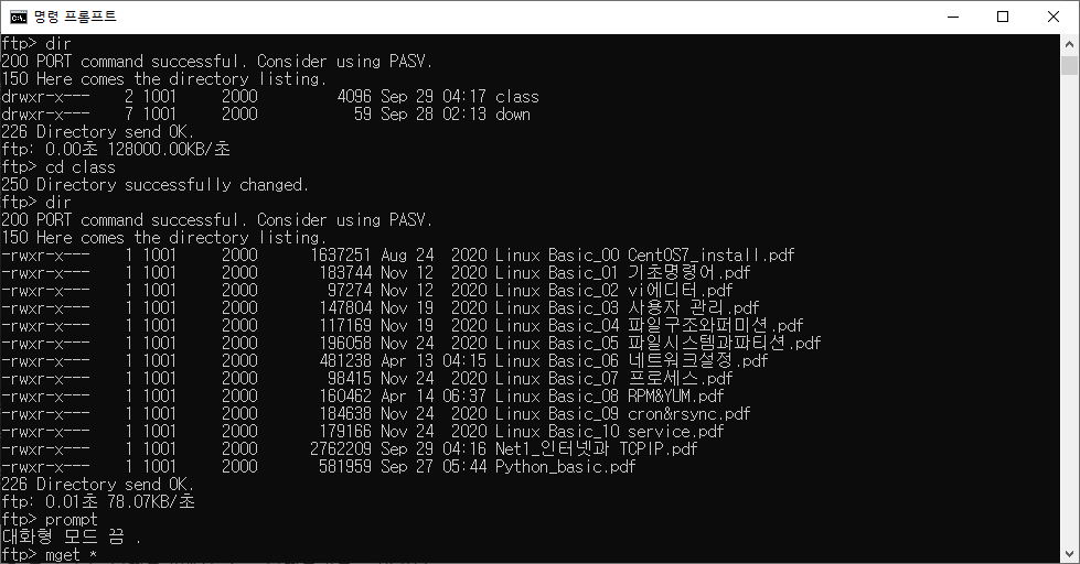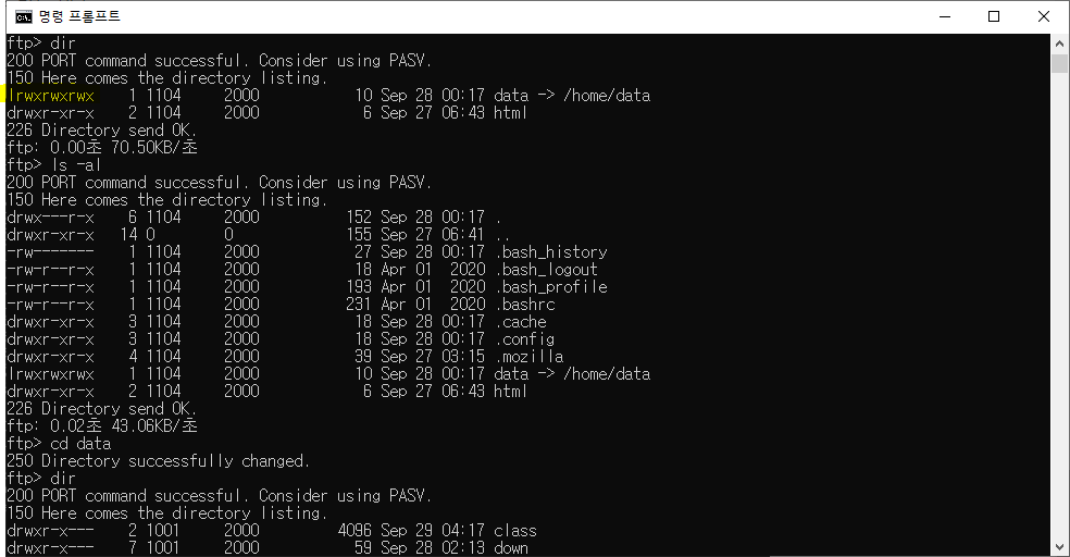 ftp에서 디렉토리 목록을 보고 [cd data], [cd class] 명령어를 이용해 data 디렉토리에서 class 디렉토리로 들어간다.