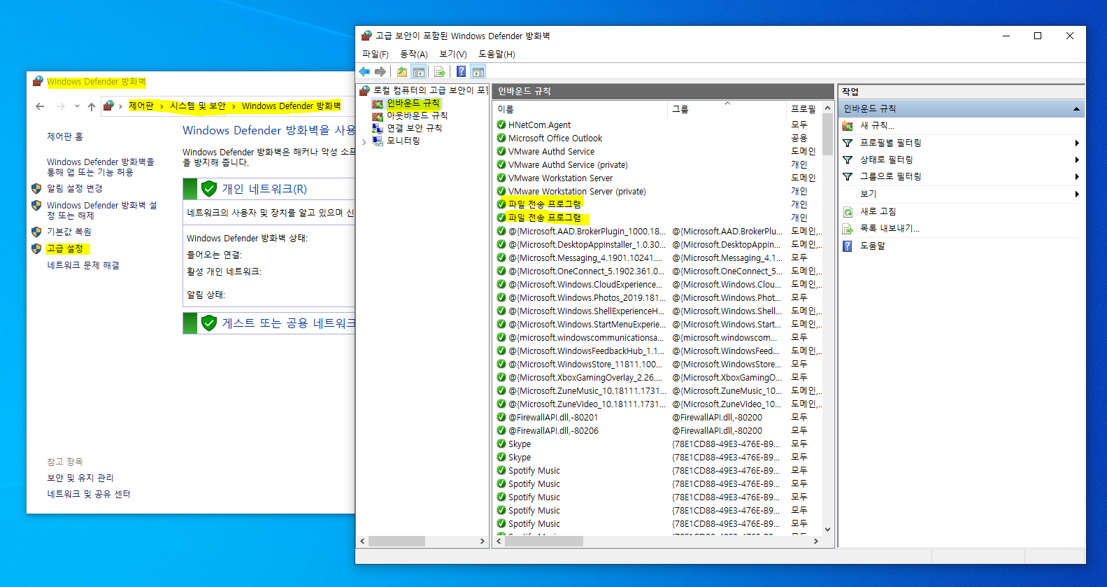 [ 제어판 > 시스템 및 보안 > Windows Defender 방화벽 > 고급설정 > 인바운드 규칙] 에서