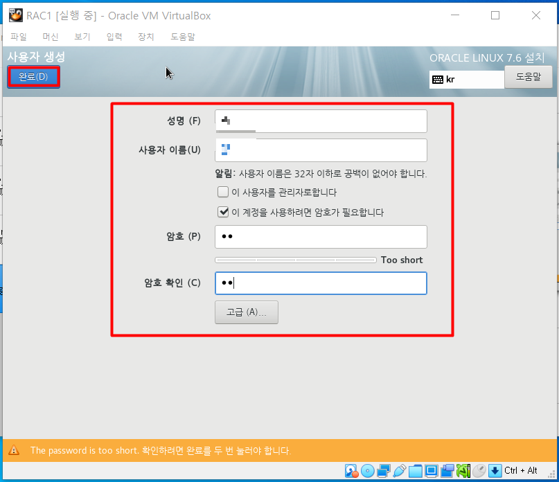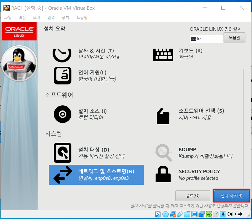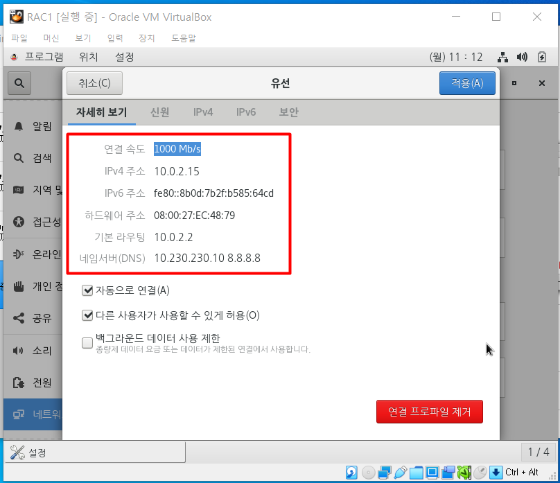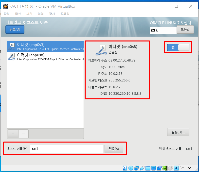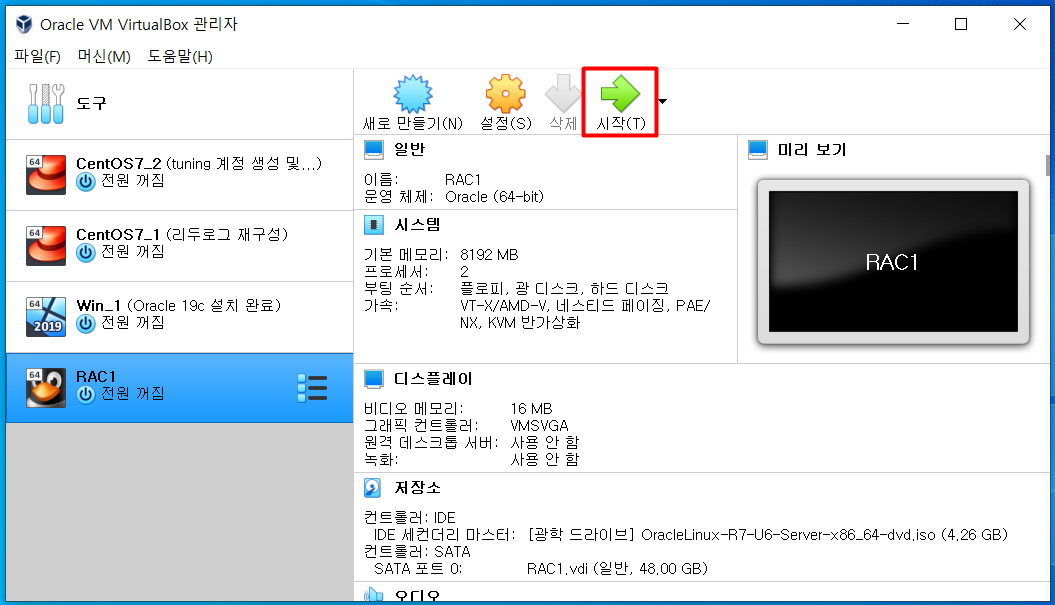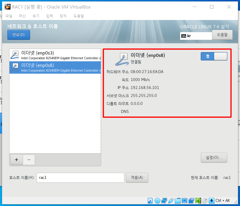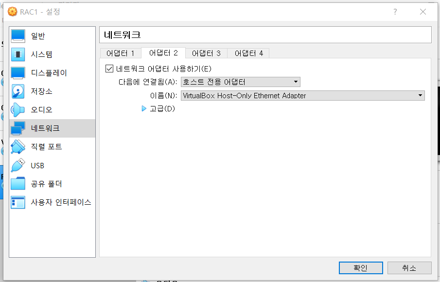 | RAC1 | rac1 | 8GB | NAT 네트워크 | 호스트 전용 어댑터 | 리눅스 설치 |