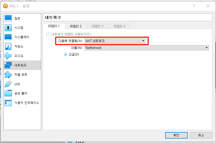 어댑터 1 - NAT 네트워크 설정