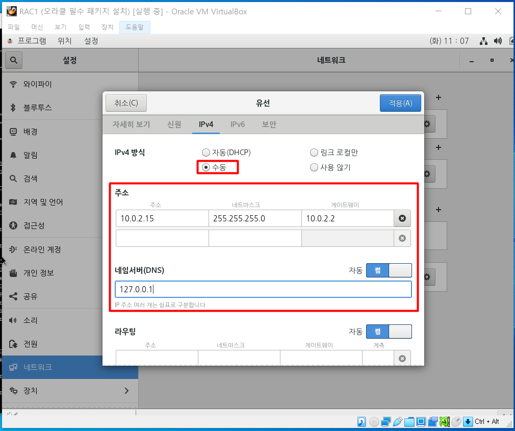 IPv4의 네트워크는 수동으로 설정 후 고정 IP를 넣는다.