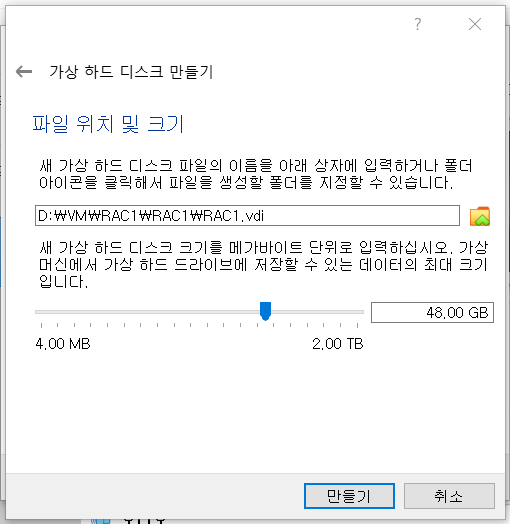 | RAC2.vdi | 48GB | RAC2 스토리지 영역 |