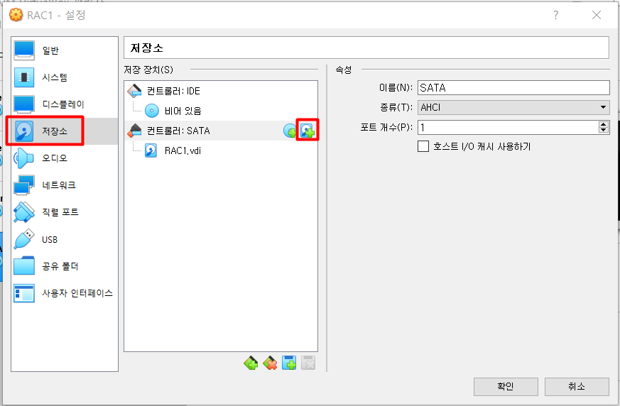 RAC1 설정에 들어가 저장소를 선택 후 컨트롤러에서 스토리지를 추가한다.