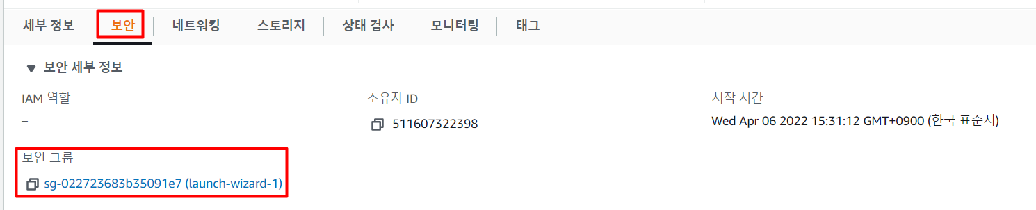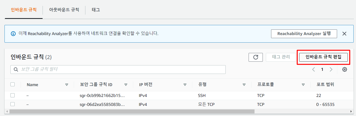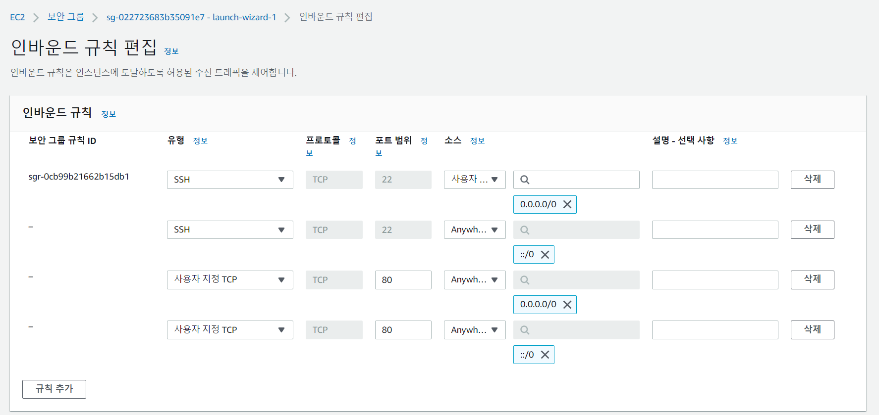 이것은 보안 문제로 인스턴스 보안그룹의 인바운드 규칙을 수정한다.