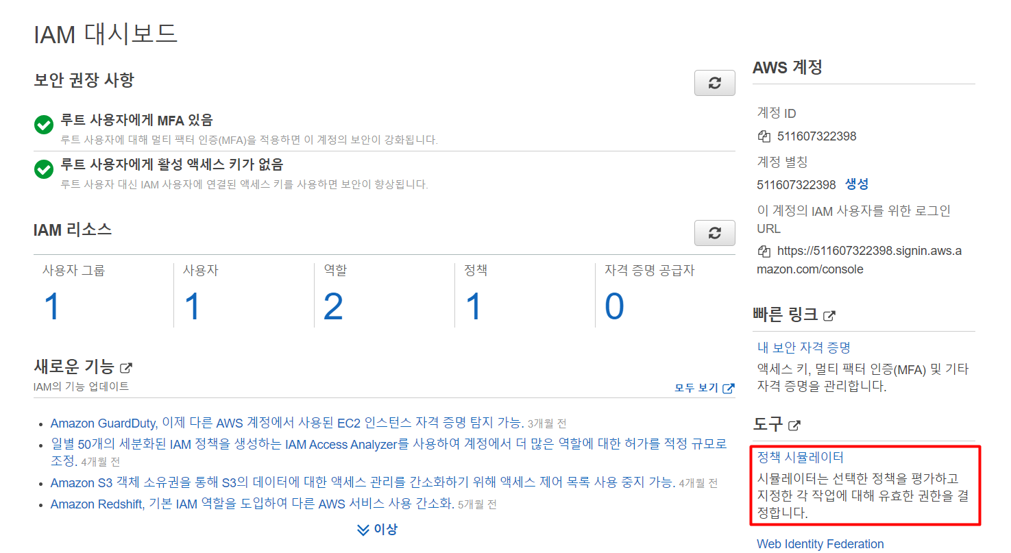 | IAM 실습 - 사용자, 그룹, 역할, 정책 생성 및 정책 시뮬레이터 (0) | 2022.04.06 |