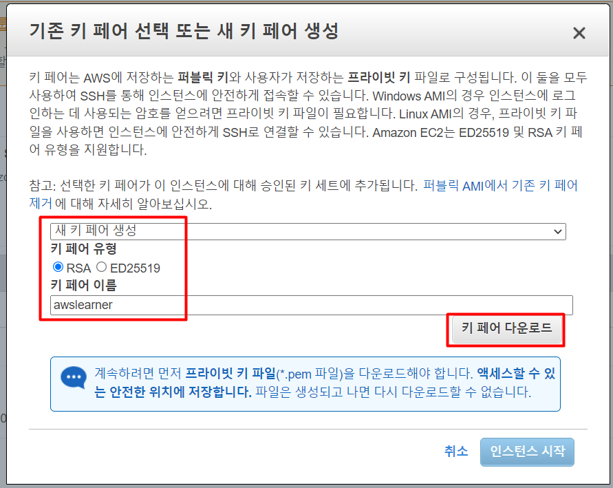 키페어 생성이 뜨면 키페어를 생성하고 다운로드한다.