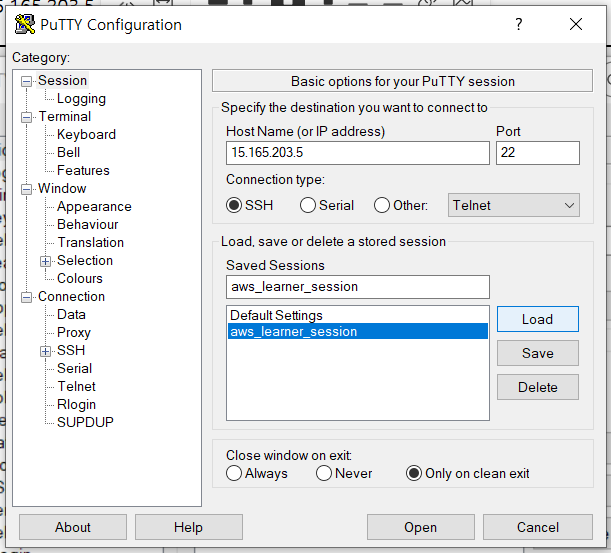 퍼블릭 ipv4 주소를 putty에 입력한다.